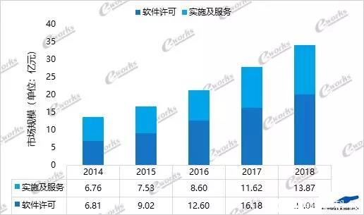 2018年,MES軟件許可市場占比為59.1%,市場規(guī)模為20.0億元,增長23.9%,實施及服務市場占比為40.9%,市場規(guī)模為13.9億元,增長19.4%。